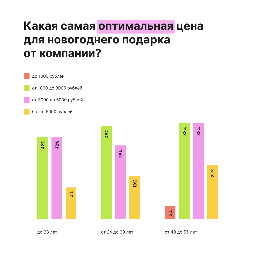 Когда речь заходит о стоимости подарка, большинство сотрудников называют диапазон 1000–5000 рублей оптимальным. Сотрудники старше 40 лет чаще выбирают подарки дороже 5000 рублей, но это всё же менее распространённый выбор. Подарки стоимостью до 1000 рублей почти никому не интересны.
