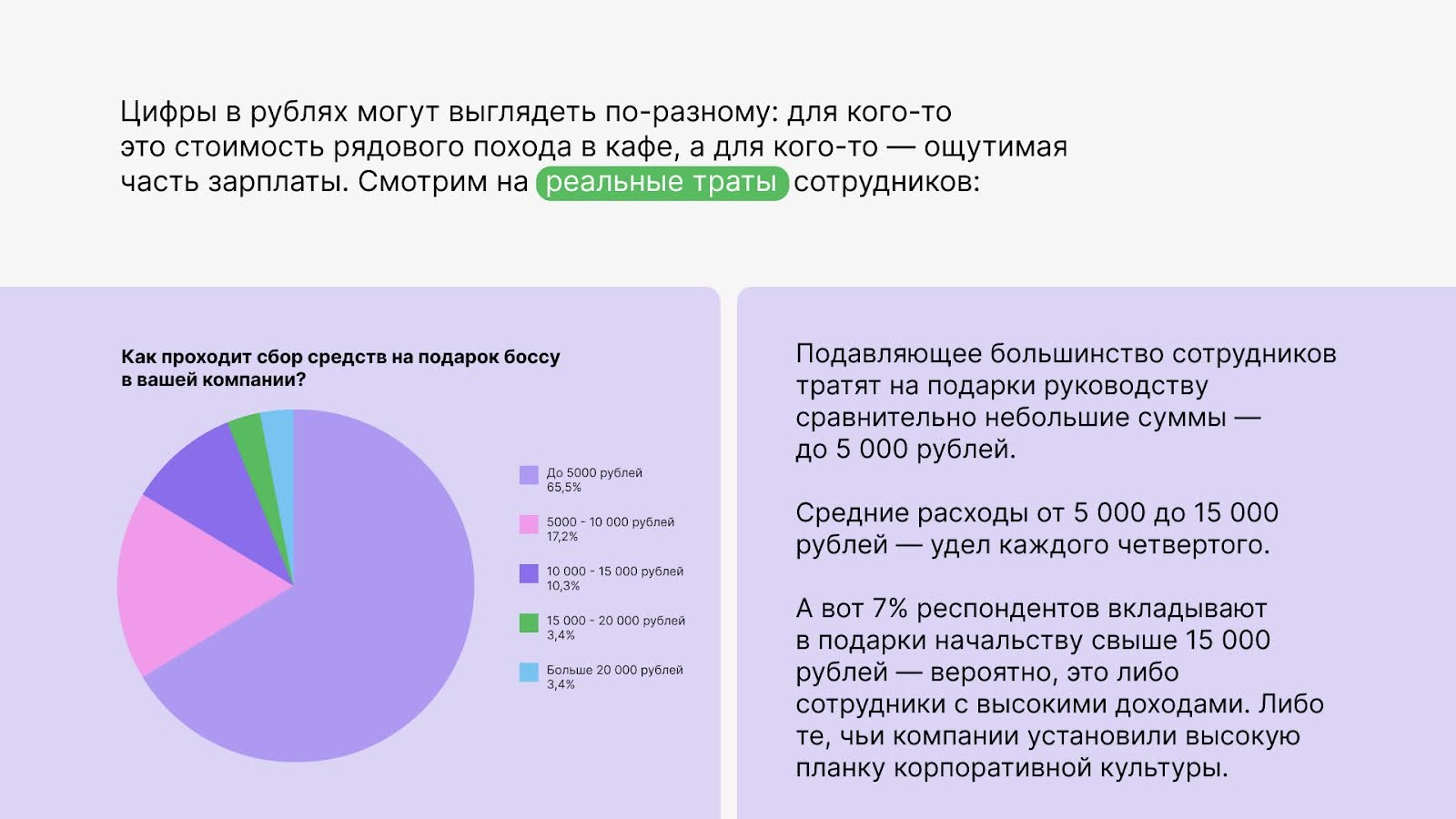 Основная часть — около ⅔ опрошенных — ограничивается суммой до пяти тысяч рублей. Это самый комфортный для многих финансовый порог, который не вызывает открытого сопротивления. Однако реальность не для всех одинакова: почти 28% сотрудников вкладывается в более весомые сборы и скидывается по пять-пятнадцать тысяч рублей на подарок боссу. А небольшая, но заметная группа — около 7% респондентов — преодолевает планку в пятнадцать тысяч.