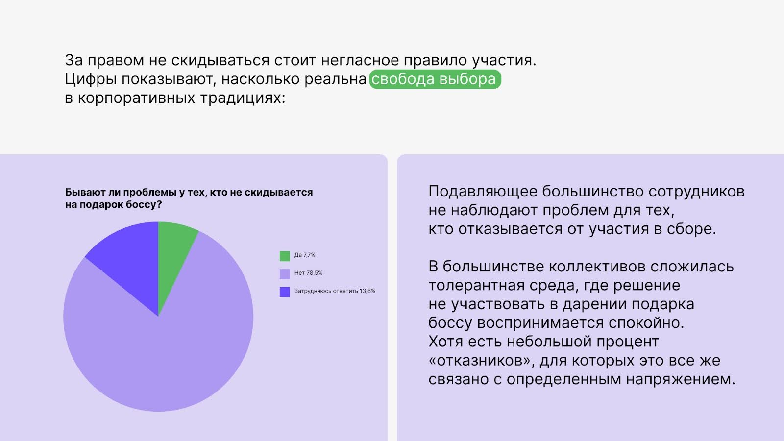 Наше исследование позволяет выделить несколько типов «антимотивации», которая движет «отказниками». Кто-то принципиально не приемлет саму идею «вертикальных» подарков в профессиональной среде. Другие могут испытывать финансовые трудности, и для них даже самый скромный взнос становится ощутимой нагрузкой. Третьи просто следуют своим убеждениям, считая, что подарок должен быть искренним, а не потому что «так надо».