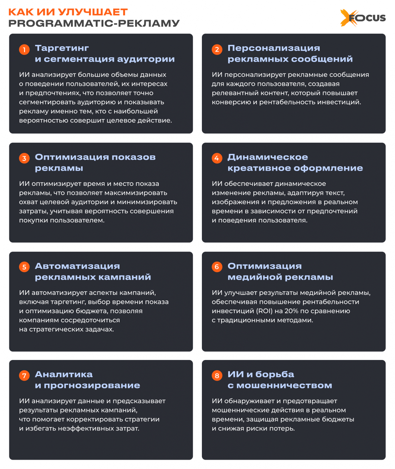 Сегодня использование ИИ в programmatic-рекламе — это не просто тренд, а необходимость для успешного ведения бизнеса. Компании, которые уже сейчас внедряют ИИ, значительно опережают своих конкурентов. XFocus предлагает лучшие решения на рынке, основанные на использовании передовых технологий ИИ, чтобы сделать вашу рекламу максимально эффективной.