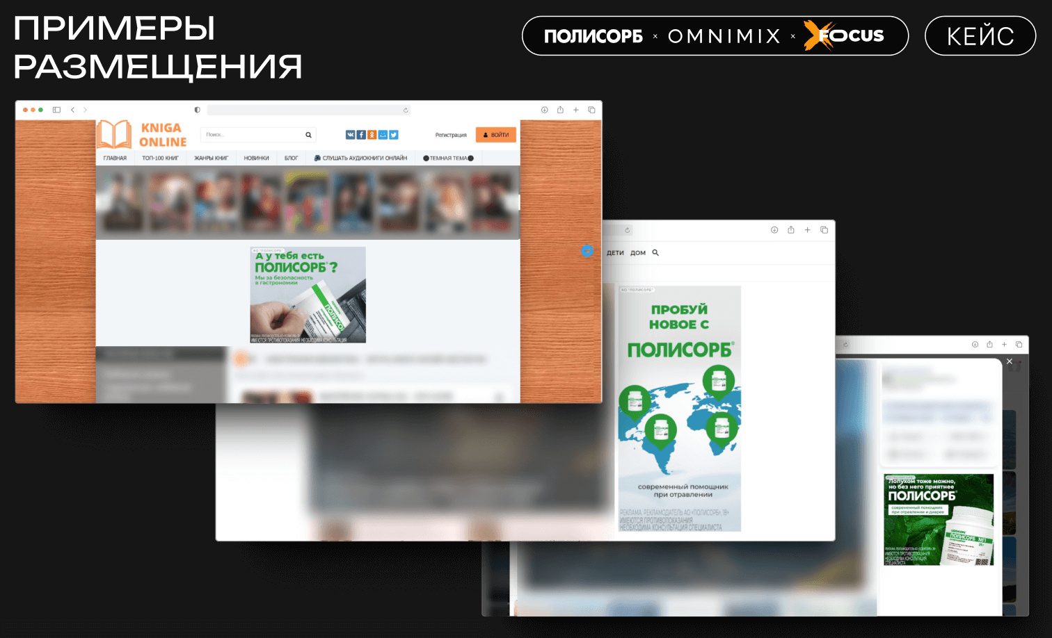 Основная цель рекламной кампании состояла в том, чтобы напомнить широкой аудитории о продукте, увеличить узнаваемость бренда и стимулировать продажи. Наша программатик-платформа XFocus стала основным инструментом для реализации данных задач. Мы предложили подход с использованием многоканальной стратегии, включающей показ баннеров и видеообъявлений, чтобы достичь максимального охвата и увеличить конверсионные действия на сайте «Полисорб».