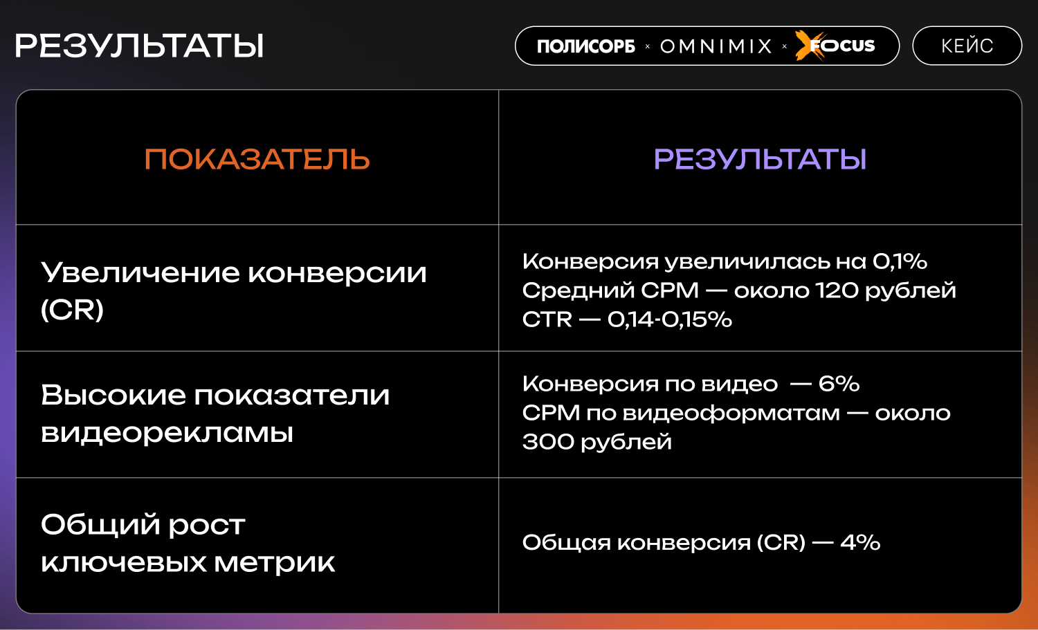 Совместная работа OMNIMIX и XFocus позволила достичь всех поставленных целей по рекламной кампании для бренда «Полисорб». Программатик-платформа XFocus продемонстрировала свою эффективность как инструмент для управления и оптимизации кампаний, обеспечив высокий уровень прозрачности и контроль качества рекламных размещений. За первые четыре месяца работы удалось увеличить конверсии до 4%, а видеореклама показала впечатляющий результат в 6%. XFocus стал надежным партнером для агентства OMNIMIX и помог бренду «Полисорб» укрепить свои позиции на рынке, расширить аудиторию и повысить эффективность рекламных вложений.