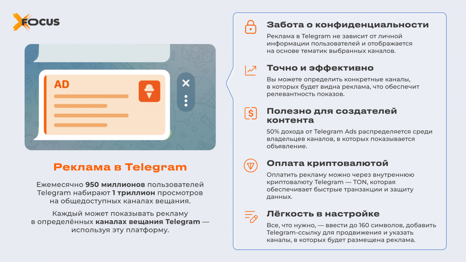 Запуск рекламы через XFocus в Telegram позволяет брендам выстроить полноценную рекламную стратегию, которая будет учитывать все нюансы мессенджера и специфики аудитории.