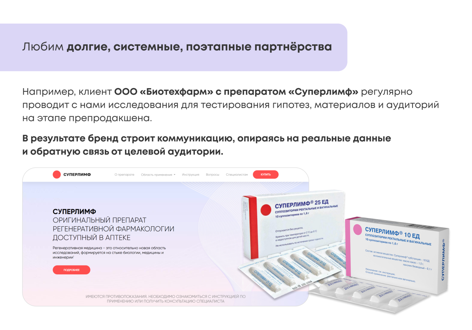 Фармацевтический препарат с большой, многолетней, бренд историей и богатой доказательной базой регулярно проводит с нами исследования для тестирования гипотез, материалов и аудиторий на этапе препродакшена. В результате бренд строит коммуникацию, опираясь на реальные данные и обратную связь от целевой аудитории.