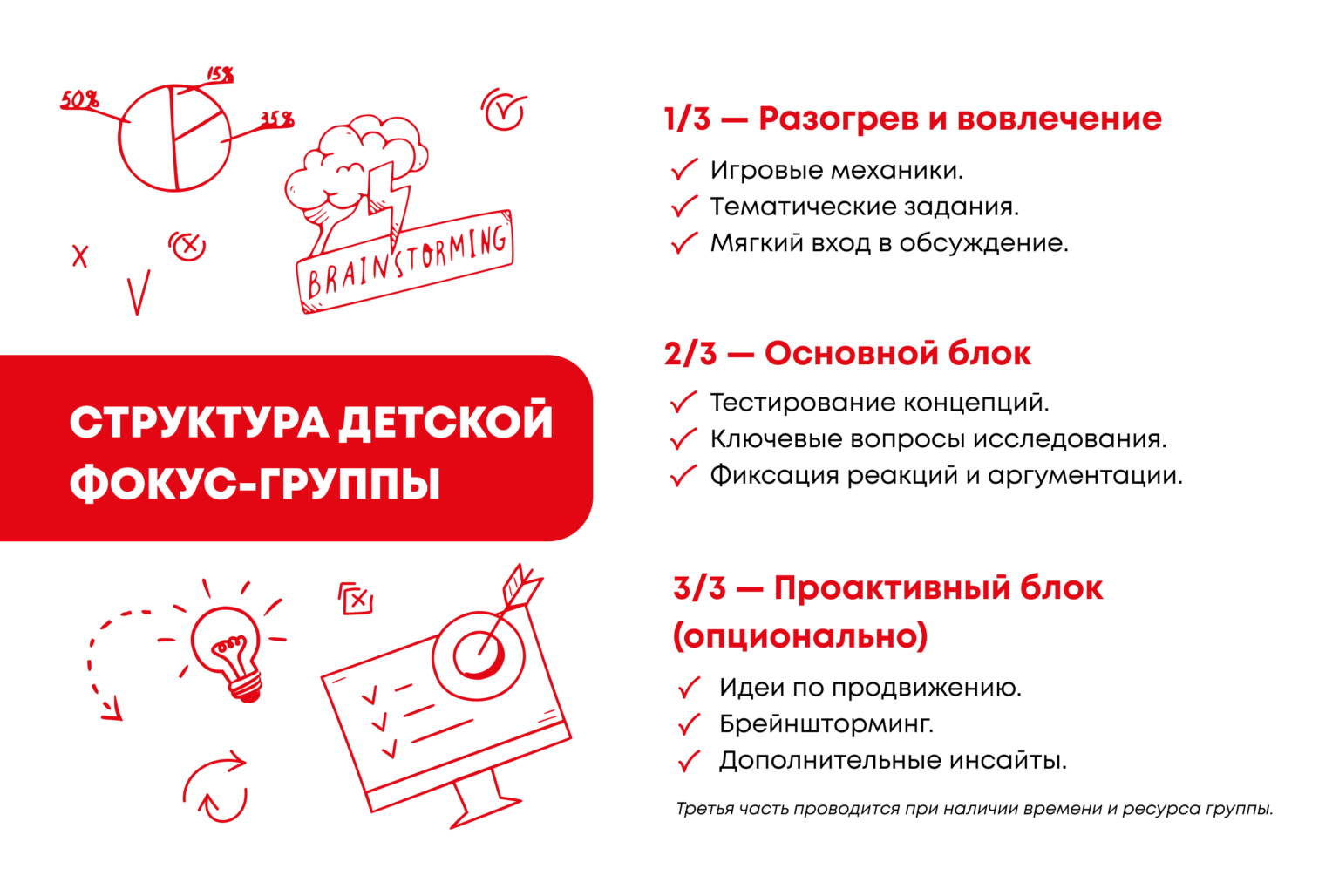 - Анкетирование детей (разные форматы под разные возраста / оценка концепций в понятной форме)