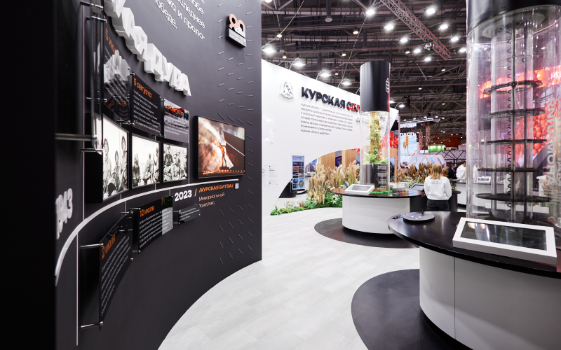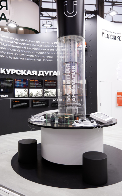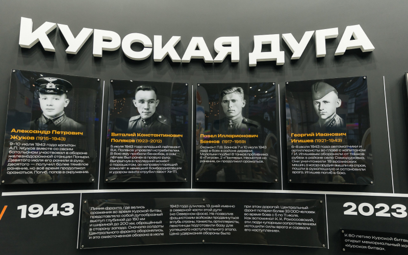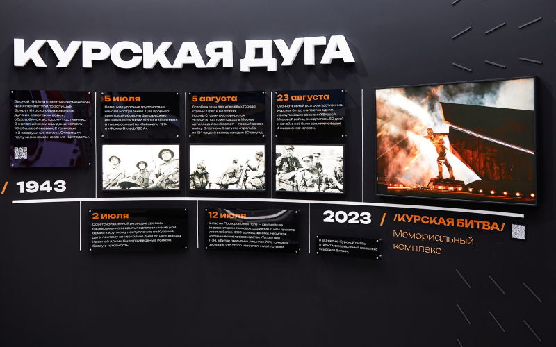 1. Историческая экспозиция, рассказывающая о Курской дуге. Гости могли узнать больше о событиях Курской битвы, которая длилась 50 дней и повернула ход Великой Отечественной войны. Последняя точка на таймлайне (23 августа 2023 года) повествовала о торжественном открытии мемориала «Курская битва» в Понырях, где 80 лет назад находился северный фас Курской дуги. Для разработки этого макета команда проекта привлекала специалистов исторического сообщества и Курского военно-исторического музея.