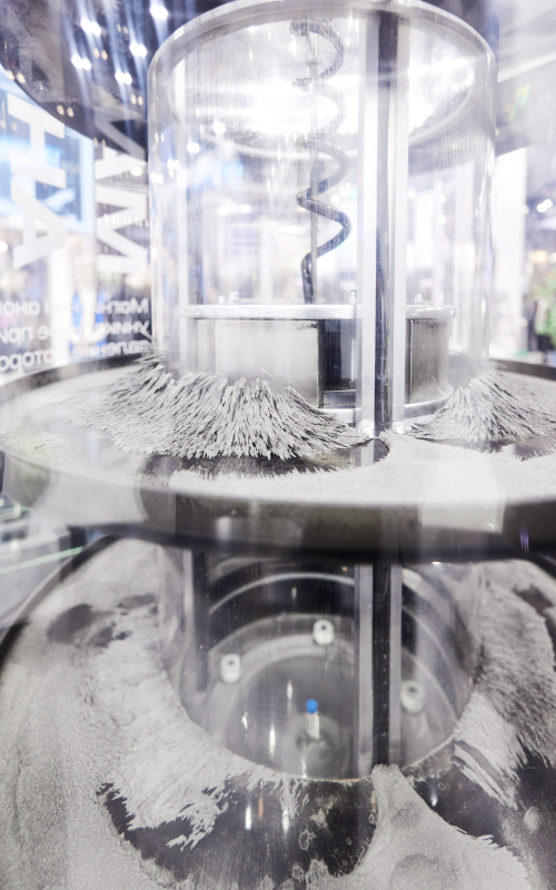 2. Интерактив «Магнитная аномалия». Он представлял из себя большую колбу, внутри которой была расположена прозрачная труба с двумя подвижными электромагнитами и железной стружкой. Когда посетитель подавал питание на электромагниты, они начинали двигаться по вертикали, притягивая к себе стружку. А внутри колонны появлялись красивые «ежики» вокруг магнитов.