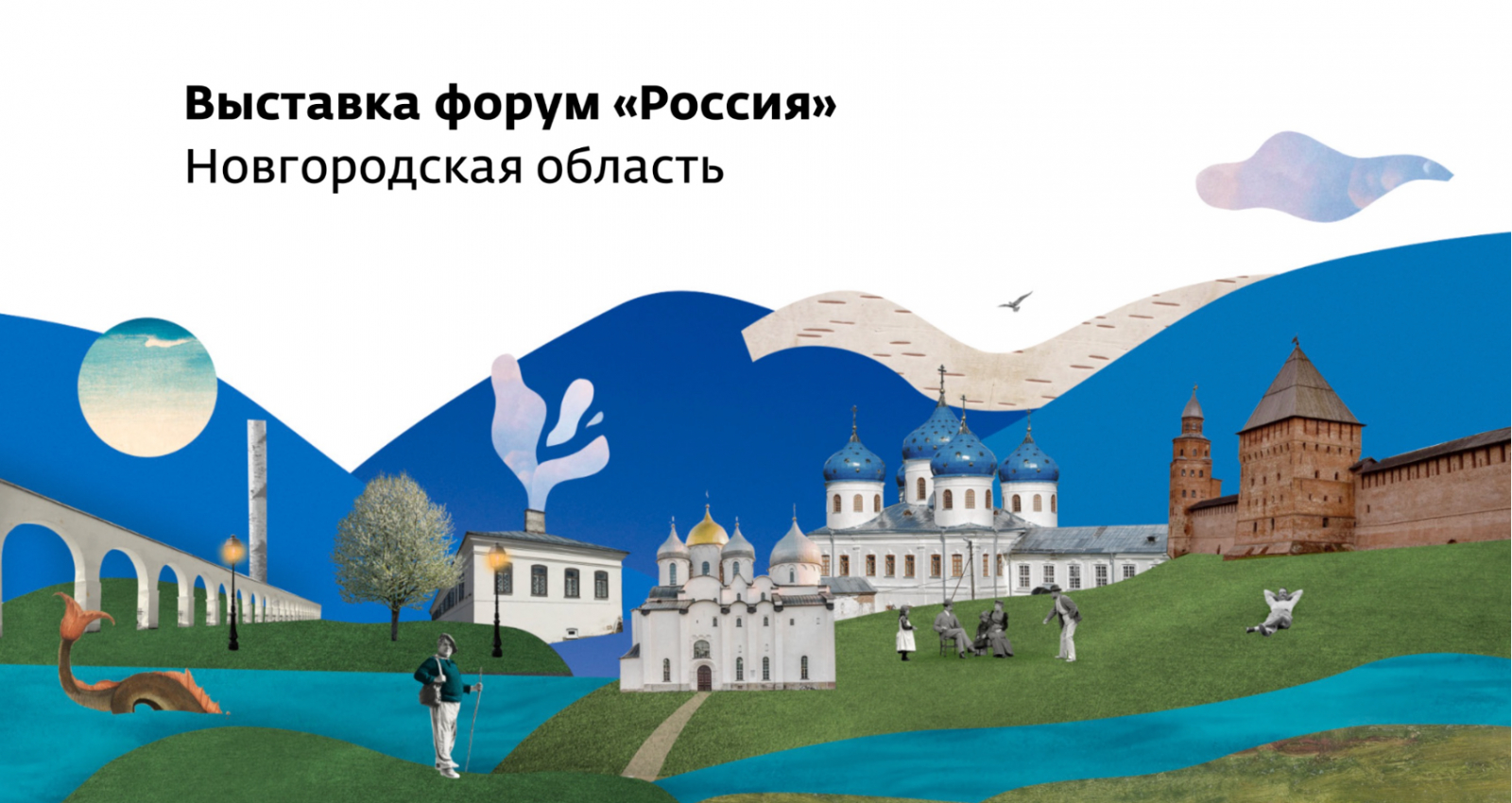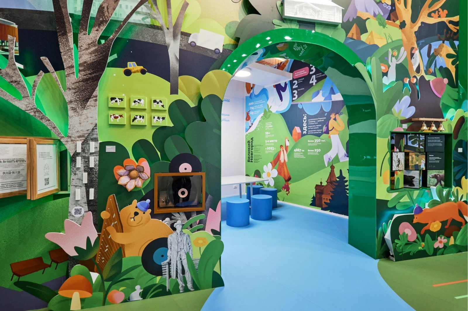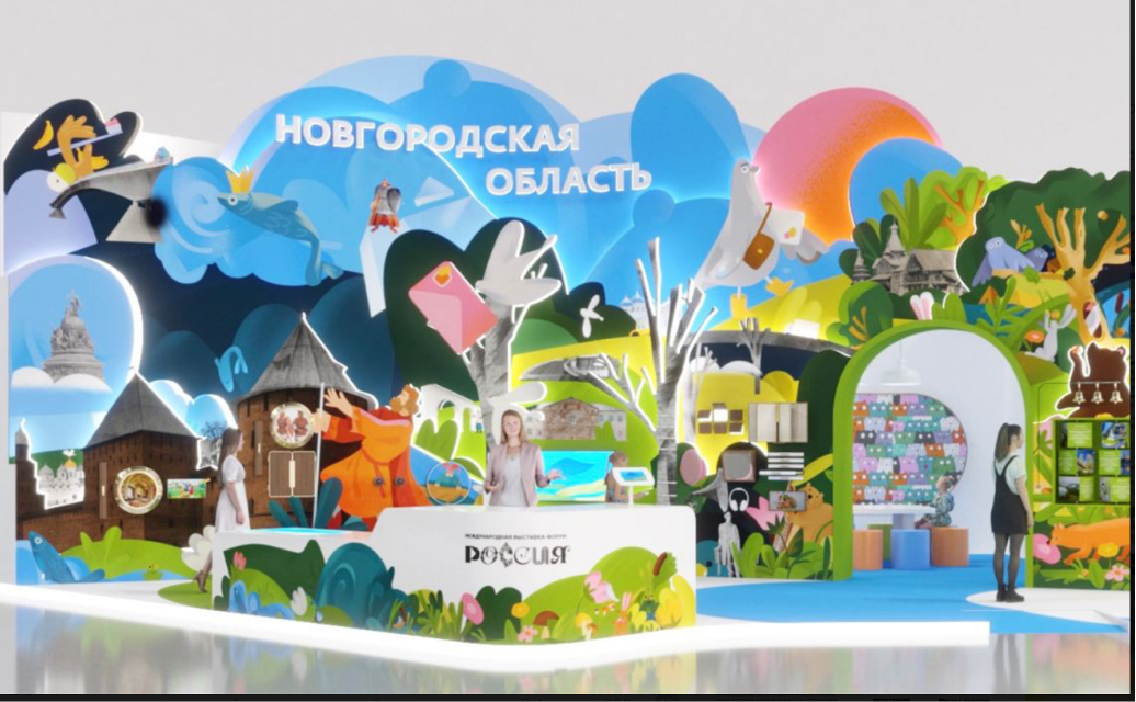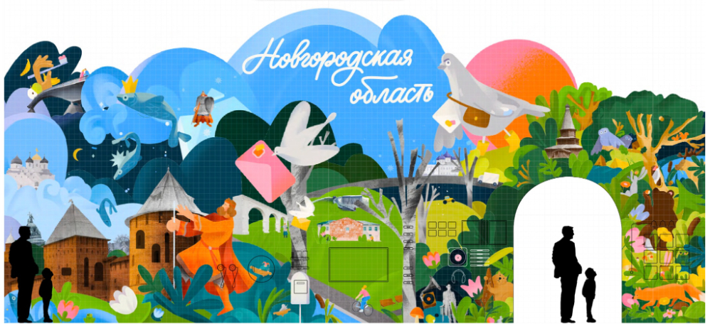 Креативная команда понимала, что у Новгородской области очень много образов и символов. Но так как площадь стенда была невелика, — всего 84 кв. м, — и внимание гостя длилось не более 10 минут, выбрали около 30 самых ярких образов региона. А затем иллюстратор объединил их на красочной «картине региона».