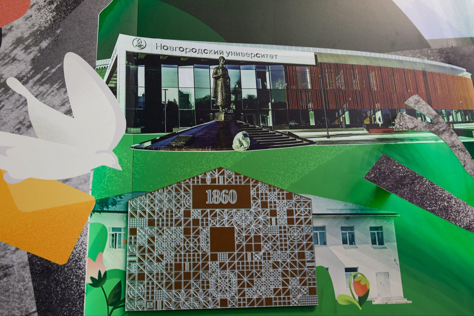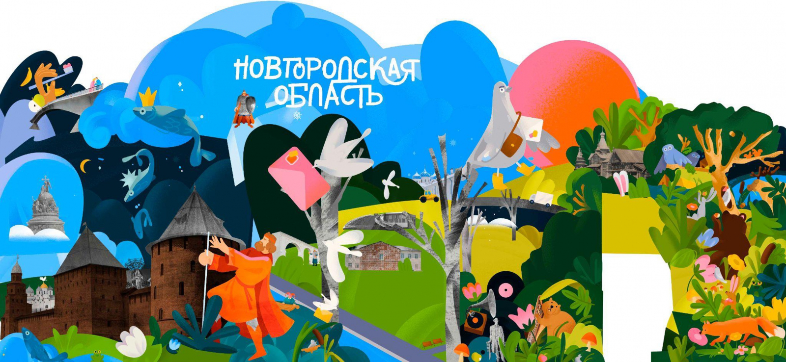 Начали с глубокого исследования, чем гордится регион, какие смыслы он хранит. Однако на новгородской земле сосредоточено такое количество символов и смыслов, что их не получилось уместить в один дизайн-макет. Тогда команда проекта пришла к заказчику с идеей: создать красочный монументальный коллаж из сотни ярких образов.