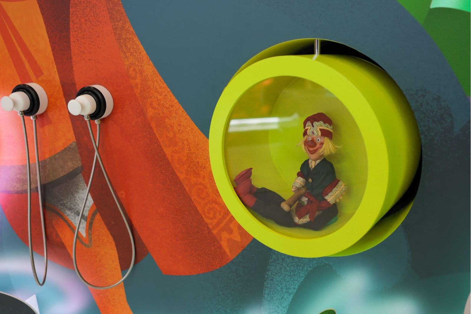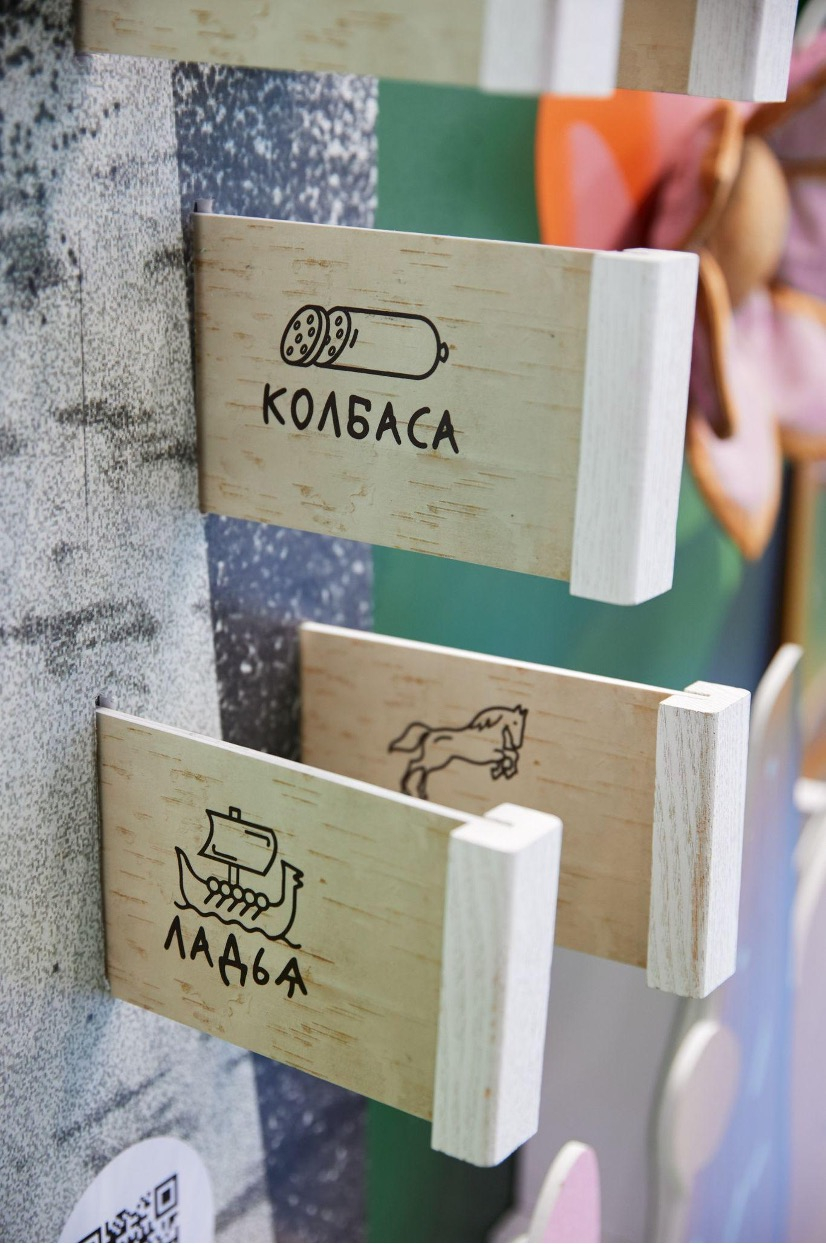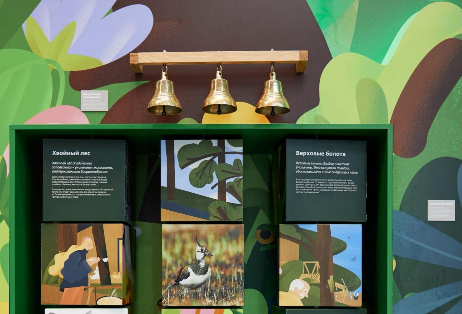 Проектная команда продумала множество интерактивных элементов, чтобы погрузить гостей в путешествие по Новгородской области. Например, найти берестяные грамоты и разгадать задания аудиогида, позвонить в валдайский колокольчик или рассмотреть настоящего театрального петрушку, которого привезли в Москву прямиком из Великого Новгорода.
