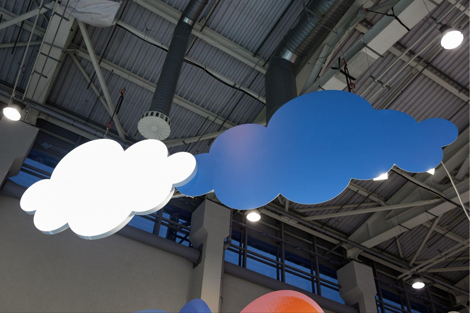 Подвес был у многих регионов. Это небольшая, но очень важная деталь, которая добавляет объем стенду и делает его заметным со всех углов выставки. Клиент очень хотел сделать подвес, однако, это было сложно реализовать по техническим особенностям проектирования выставки. К дню региона команда нашла решение, как сделать подвес на столь небольшом допустимом участке, — подвесить пару облаков, которым не требовалось много места для крепления.