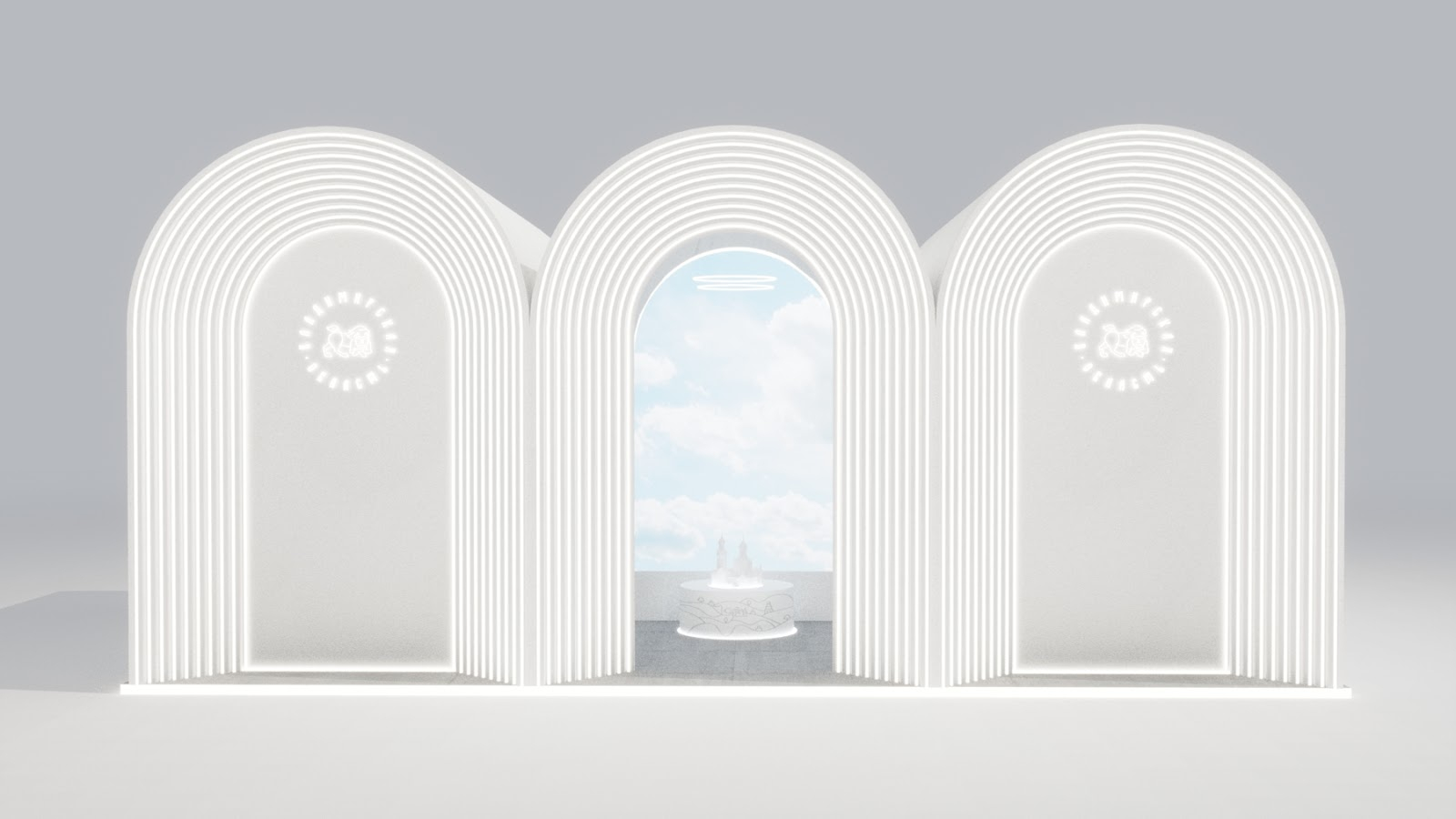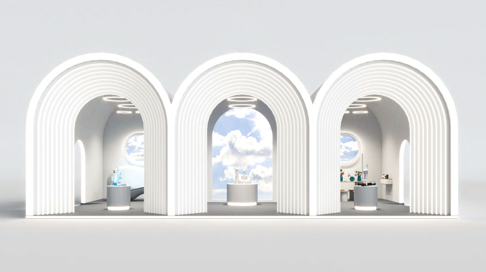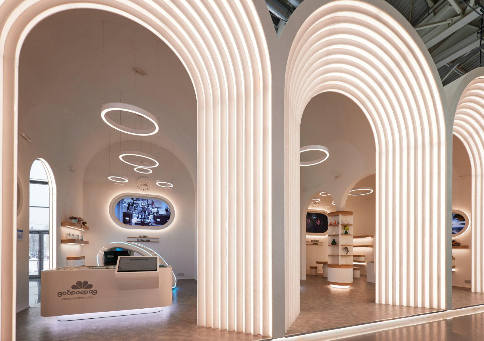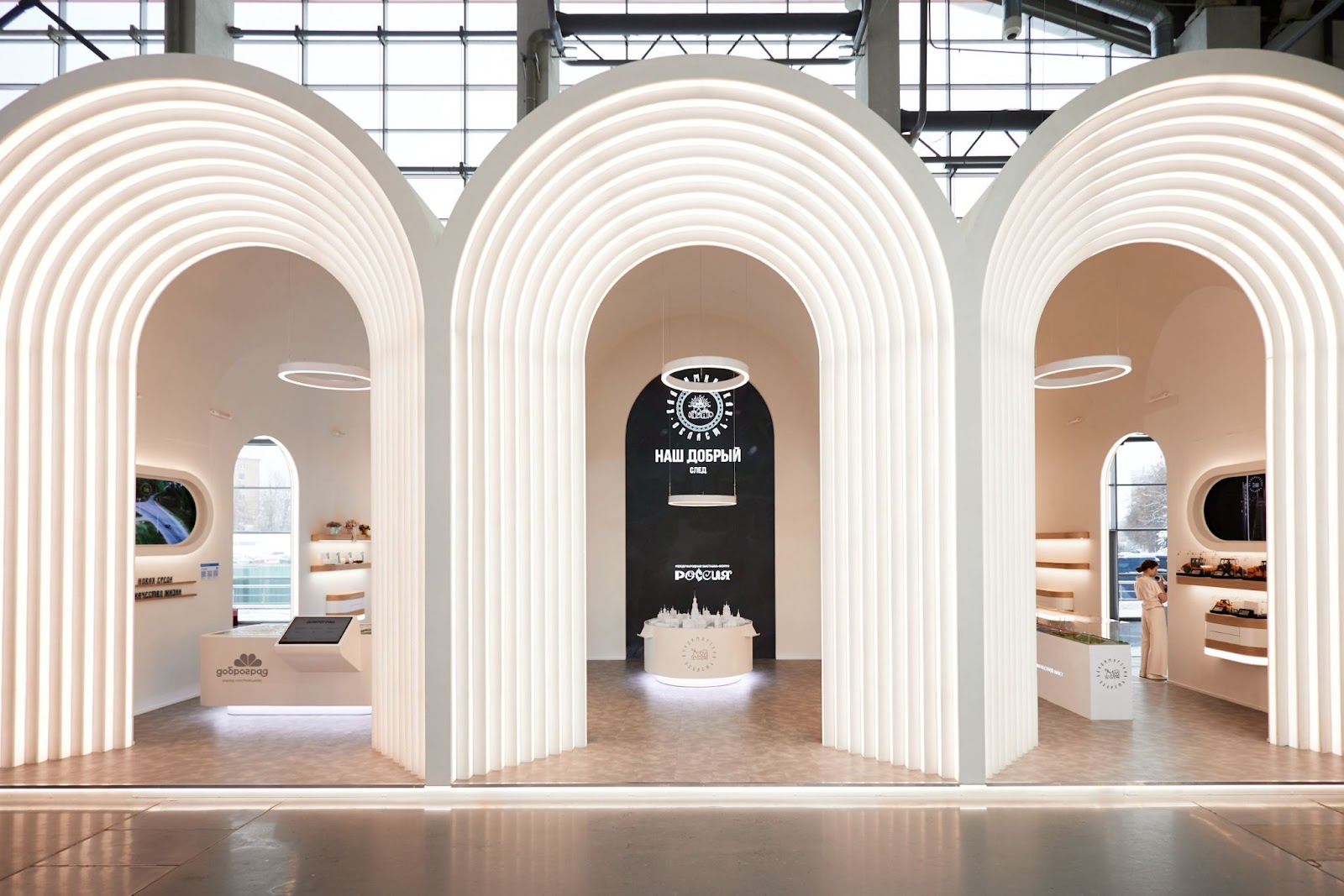 Однако по техническим требованиям выставки, застройка не могла быть полностью закрытой, и первые чертежи не проходили согласование. Нам хотелось сохранить лаконичные арки в архитектуре стенда, и на второй итерации попробовали сделать их более открытыми.