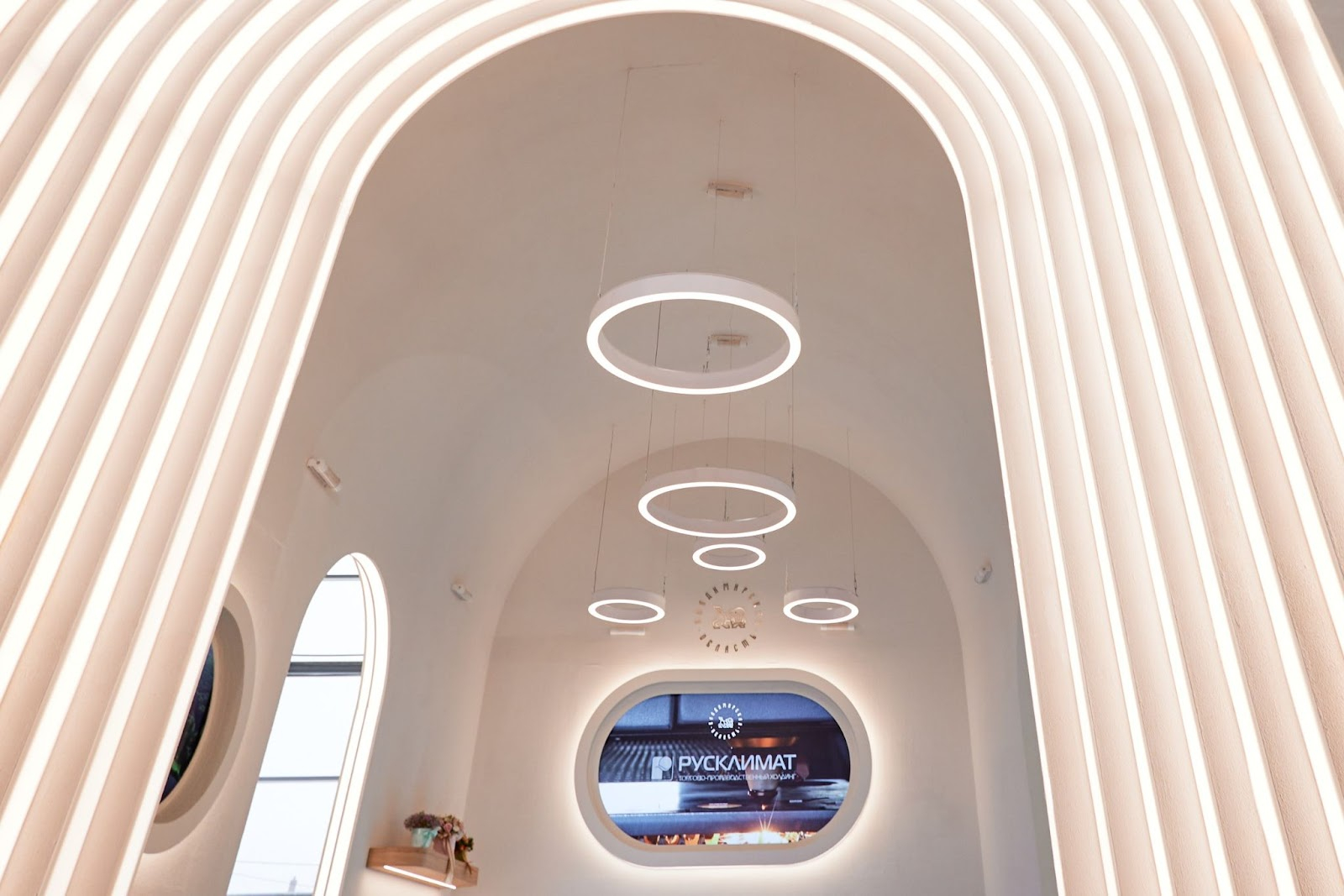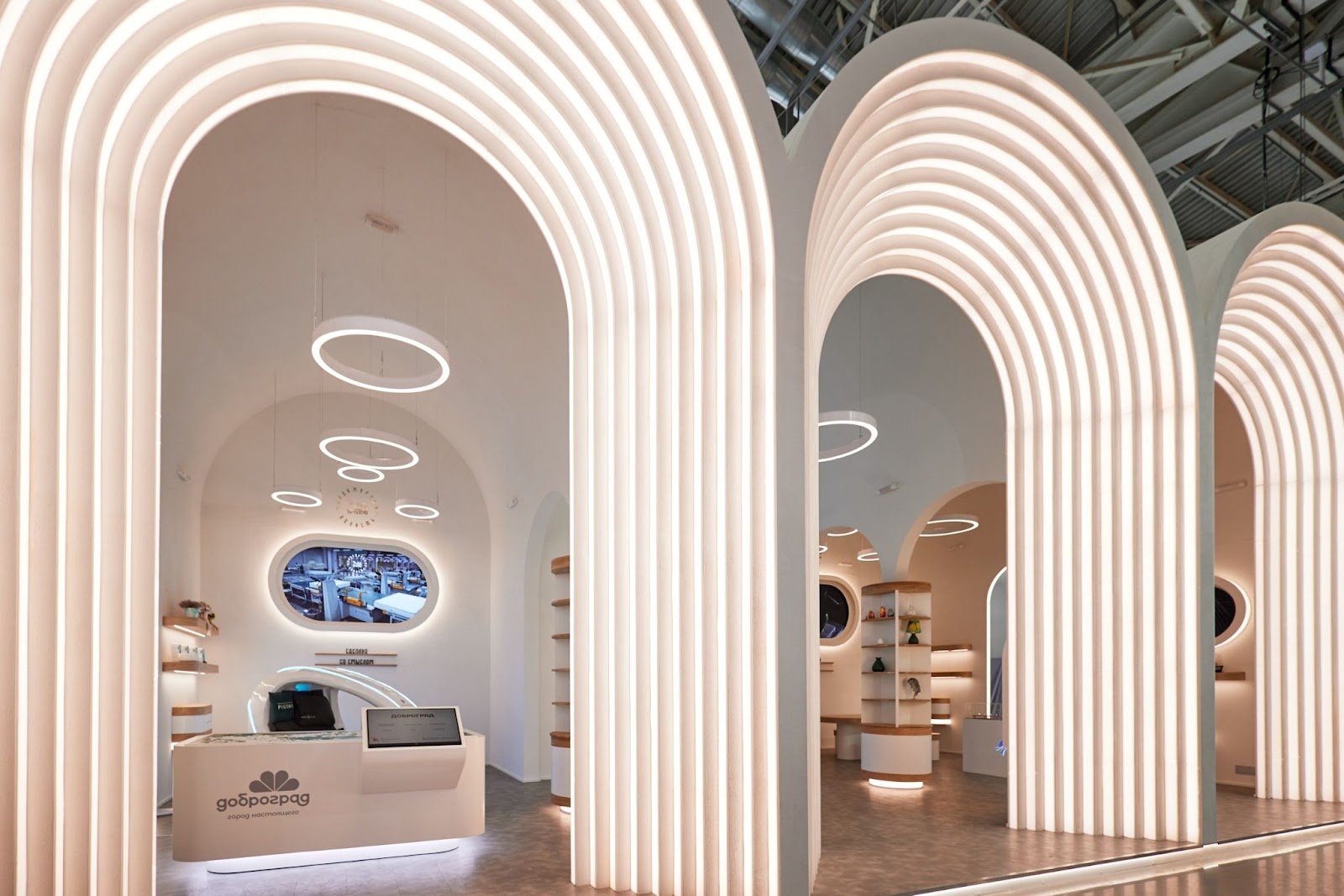 Появились арки, которые напоминают Покрова на Нерли, при этом исполнены современно и лаконично. А также конструкции из стекла и современные цифровые носители: LED-экраны, плазмы и touch-панели.
