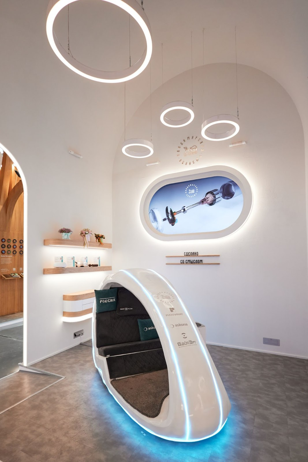2. Многофункциональная «капсула». Это закрытое пространство с системой кондиционирования, где гость мог отдохнуть от городской суеты на современном матрасе, полежать на умной подушке от Askona, подышать чистым обеззараженным воздухом. Бренд Askona появился не просто так, — во Владимирской области находится головной офис и фабрики компании.