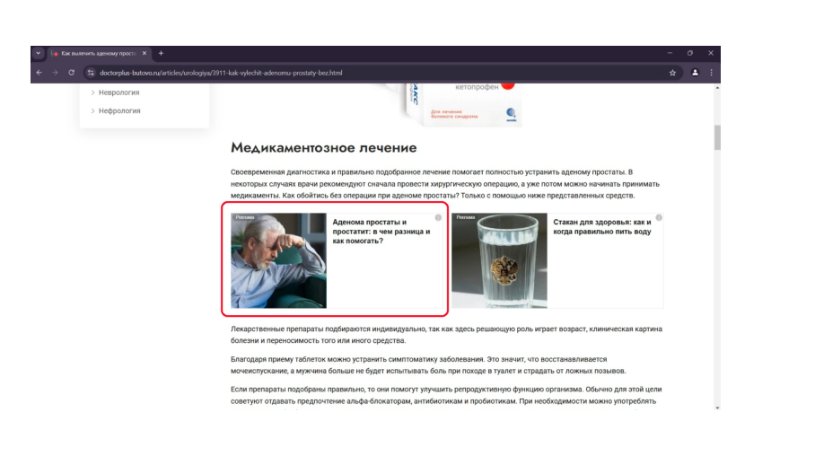 -Нативный программатик (Natiscope). Здесь для каждого сегмента была построена индивидуальная коммуникация в виде интеграции в релевантный контент со статьями на тему: "Признаки аденомы простаты: как распознать недуг", "Симптомы аденомы простаты", "Лечение аденомы" и др.
