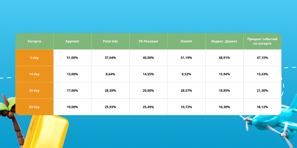 Мы ставили контрольные точки для отслеживания эффективности трафика в 0, 14, 30 и 60 день когорты. В результате выявили, что более 40% аудитории совершает целевое действие после 30-ого дня когорты, хотя в период с 1-ого по 14-ый день конверсия резко падает. Пользователи, совершившие покупку в 0 день, обычно интересовались «горящими» предложениями. Остальные же пользователи брали паузу на сравнение предложений и поиск идеального тура.