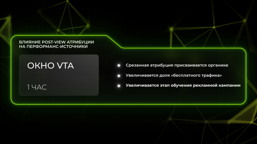 Рассмотрим на примере, к чему приводит оценка эффективности источников только на основе поведения органики. В 2024 году появился тренд, который не теряет актуальности сейчас. Заключается он в оценке эффективности перформанс-источников по количеству конверсий с click-атрибуции. Это привело либо к полному отключению post-view-атрибуции (VTA), либо к ее сокращению.