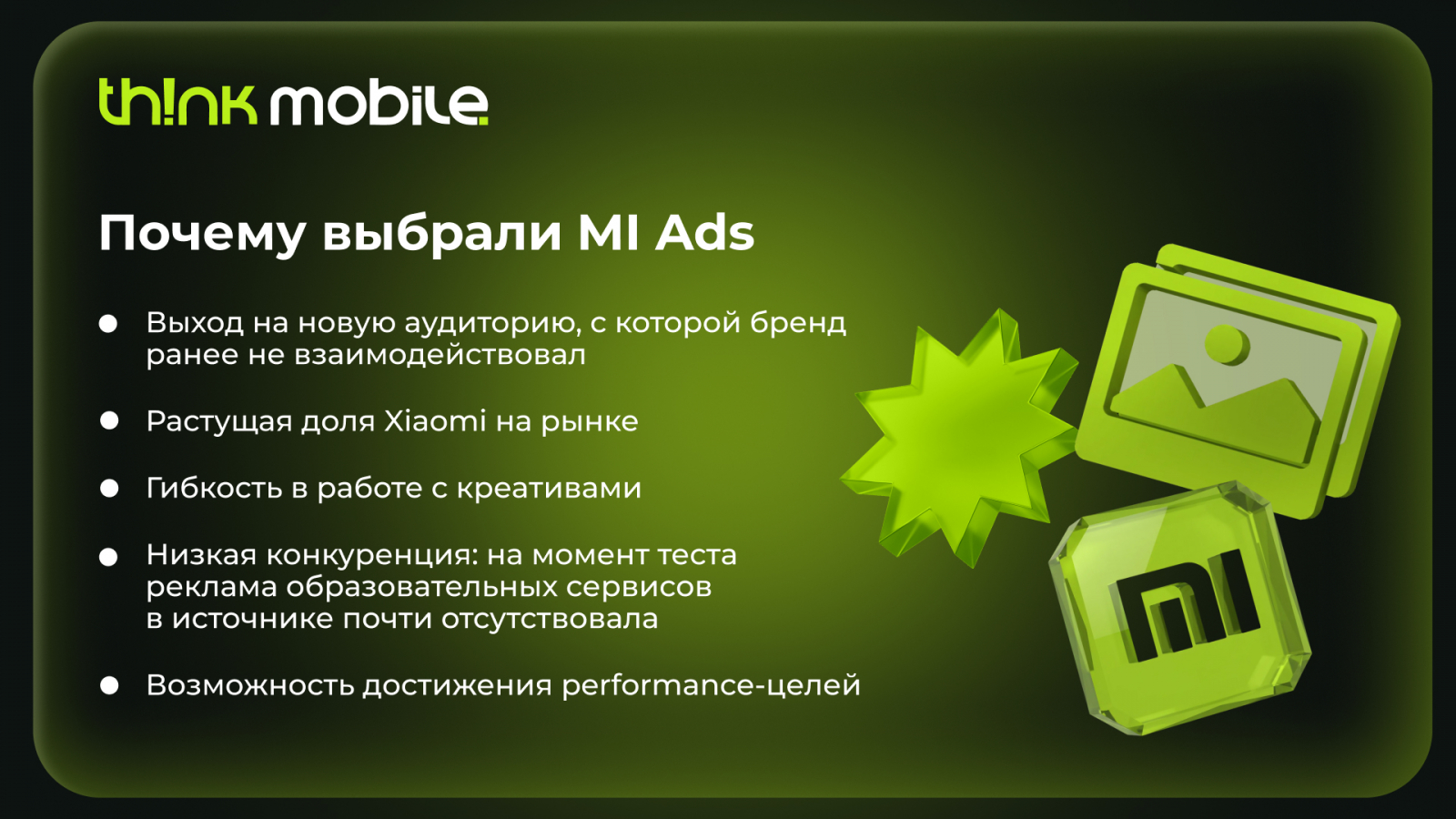 «Mi Ads продемонстрировал высокий потенциал как performance-инструмент: он включает большое количество паблишеров и открывает доступ к новой дополнительной аудитории для бренда. В текущем проекте, где привычные источники исчерпали свою ёмкость, Mi Ads позволил выполнить KPI по стоимости и привлекать качественный трафик без увеличения бюджета. Кроме того, он не требует дополнительной модификации сайта (например, установки пикселя), что снижает порог входа и обеспечивает быструю интеграцию источника в сплит»