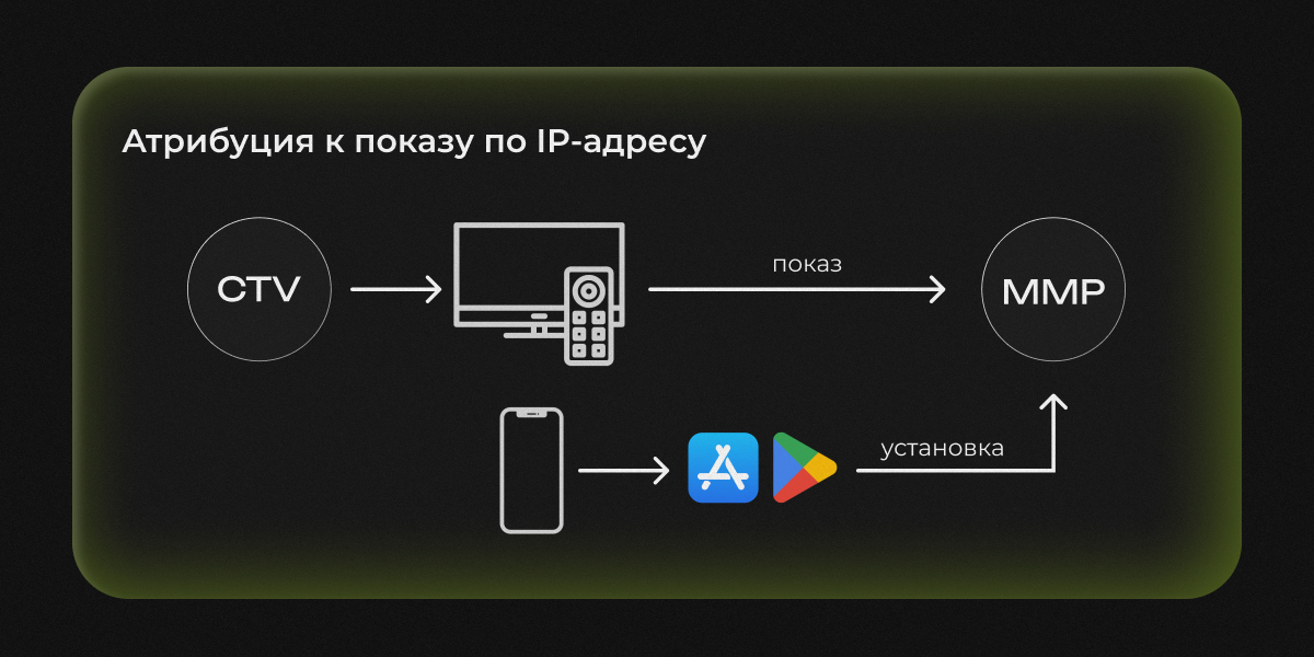 Модель атрибуции в CTV отличается от мобильных источников. Вместо детерминированной атрибуции через GAID (Google Advertising ID — идентификатор, присваиваемый устройству и генерируемый Android для показа рекламы) и IDFA (The Identifier for Advertisers — рекламный идентификатор для Apple-устройств) применяется cross-device-атрибуция (CDA).