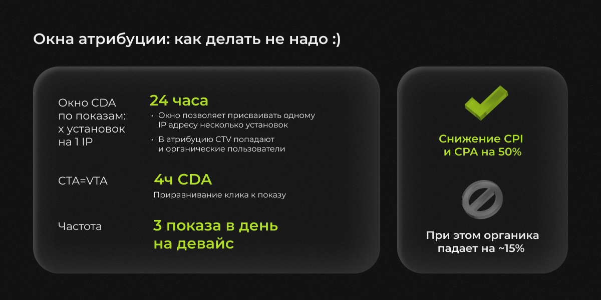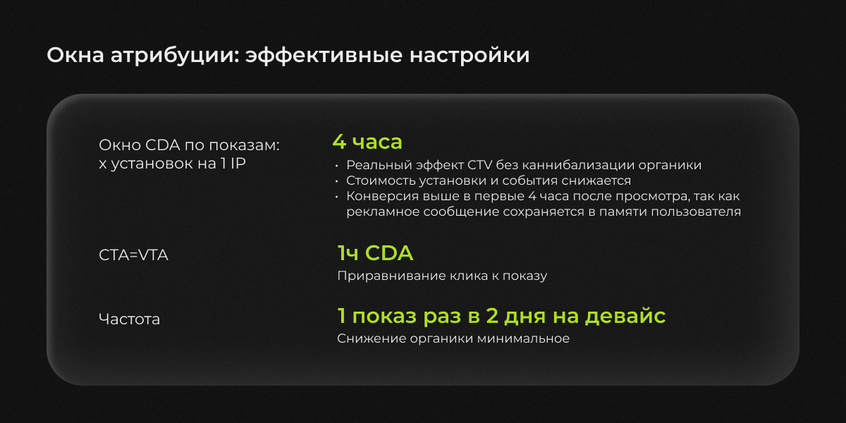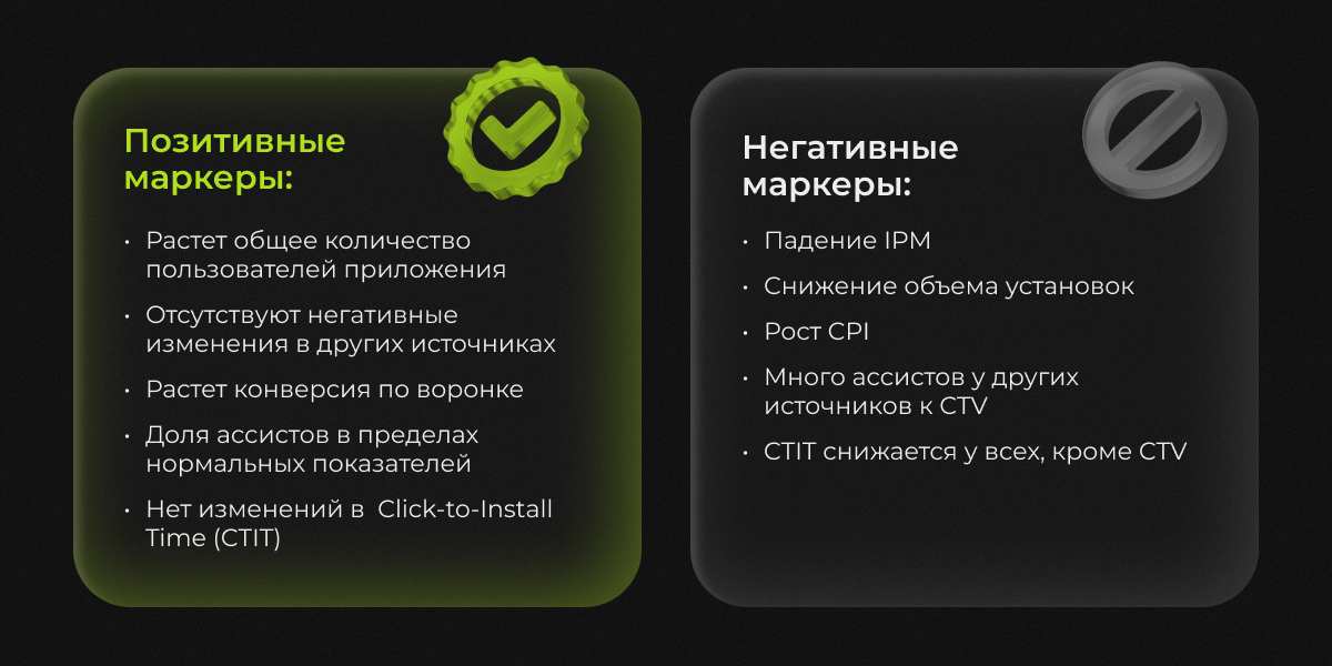 Если обнаружились негативные маркеры, нужно проанализировать CTV и другие источники — важен комплексный подход, потому что не всегда проблема в CTV. Больше всего внимания уделяем окнам атрибуции и частоте показов — эти параметры корректируем в первую очередь.
