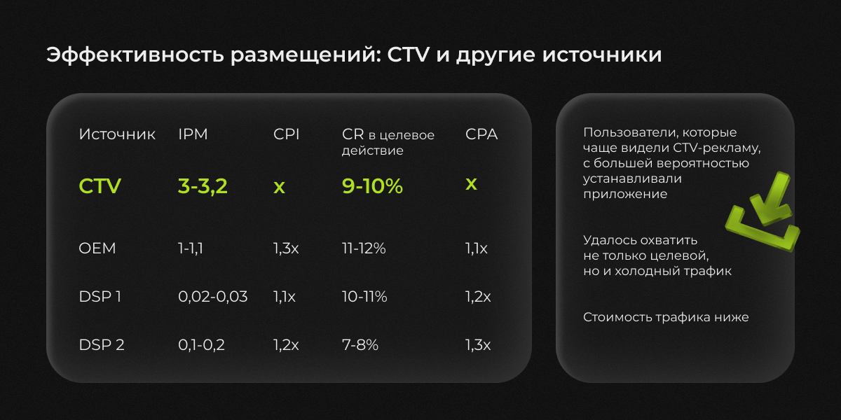 Из инфографики видно, что CTV обеспечивает значительно больше установок на каждую тысячу показов (IPM), поскольку один IP-адрес может принадлежать не только отдельной квартире, но и всему дому или кварталу. При этом источник демонстрирует конверсию на уровне других каналов. Важно, что CPI и CPA ниже, чем во всех остальных источниках, — это результат высокого IPM.