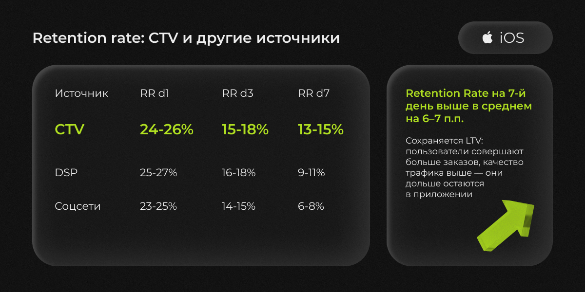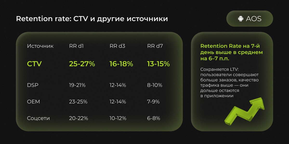 Важная особенность CTV — высокие показатели удержания (Retention rate). Это заметно в сравнении с DSP, OEM и соцсетями. Даже на 7-й день этот показатель выше, чем у других источников в сплите, на 5–7 п. п.