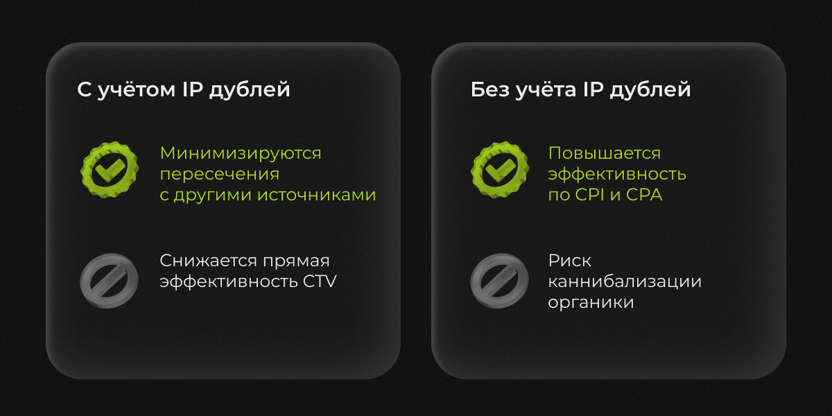 Чтобы настроить атрибуцию CTV максимально точно, важно учитывать данные по всему медиасплиту. При некорректных настройках источник может недополучать установки или «забирать» их у других из-за различий в моделях атрибуции. Поскольку с одного IP-адреса может происходить несколько установок, важно заранее определить подход к их учету — подробнее на баннере.