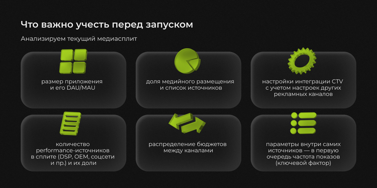 Важно корректно интегрировать CTV в мобильный сплит, чтобы избежать пересечений с другими источниками и каннибализации органики — это помогает достигать целевых показателей по установкам (CPI) и действиям (CPA).