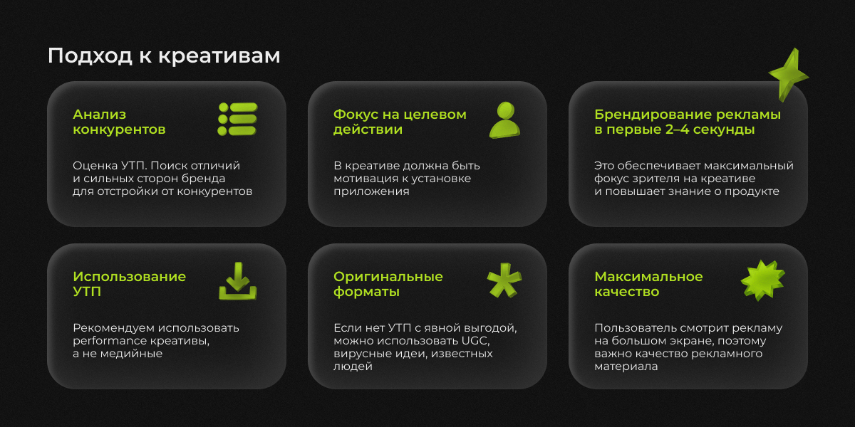Специфика телевизора требует особого внимания к креативу. Подход к объявлению можно сформулировать в шести тезисах.