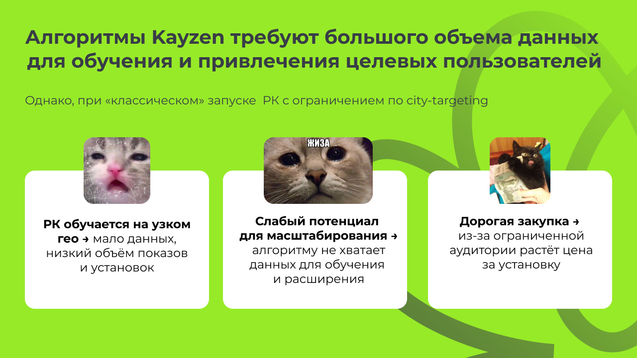 Чтобы расширить охват и привлечь новую аудиторию, команда протестировала DSP Kayzen — платформу, алгоритмы которой обучаются на данных о пользователях и их действиях, чтобы точнее привлекать целевую аудиторию. Однако в городах с небольшим населением, где представлен Drivee, классический подход к оптимизации — сужение по гео на старте — может не дать нужного результата. При узком гео алгоритму не хватает данных для корректного обучения. Даже при передаче исторических данных об аудитории и целевых действиях кампания может быть неэффективной из-за недостатка получаемых событий для обучения и оптимизации.