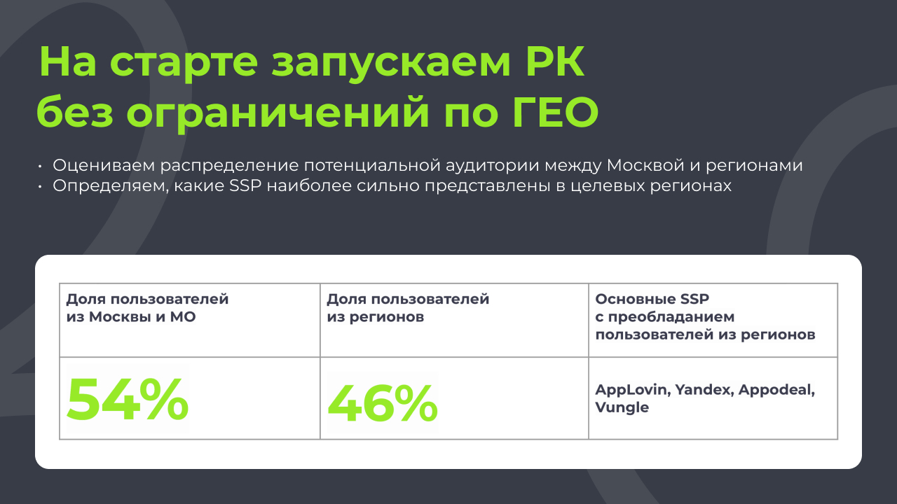 На старте оказалось, что доля пользователей из регионов в источнике была ниже, чем в Москве. При этом удалось определить, какие SSP (AppLovin, Yandex, Appodeal, Vungle) показывают наибольший отклик у пользователей в целевых городах. Это позволило выделить приоритетные зоны роста и скорректировать стратегию масштабирования на этапе оптимизации.