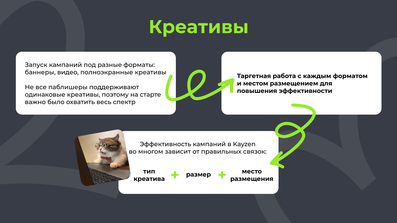 При привлечении аудитории через поиск эффективных паблишеров команда протестировала весь спектр форматов в Kayzen — нативные баннеры, видео и полноэкранные размещения, всего более 100 связок. Поскольку это DSP, где эффективность кампаний напрямую зависит от успешности связки «паблишер — креатив», именно через тестирование форматов, которые вызвали наибольший отклик у аудитории, удалось определить наиболее результативные площадки для показов.