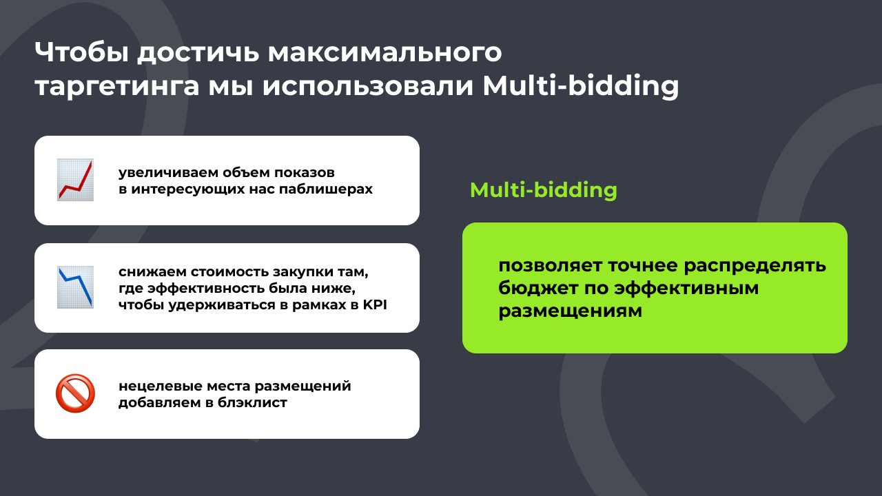 Для паблишеров, где стоимость закупки превышала KPI, команда снижала ставки с помощью Multi-Bidding, что позволило выйти в целевые показатели.