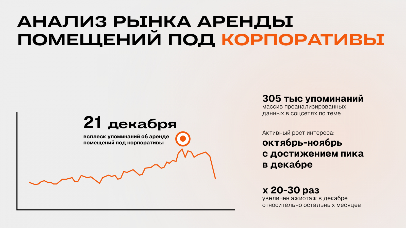 Интерес к аренде помещений для корпоративов заметно возрос к концу года. Ажиотаж наблюдался в середине декабря — именно в этот период компании активно искали место, где можно провести праздник. Аналитика показала, что на пике популярности по-прежнему остаются рестораны, однако в обсуждениях заметно повысилось упоминания других локаций: