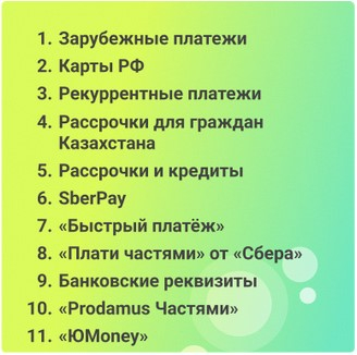 Вот какие варианты оплаты есть в Prodamus: прием платежей с российских и иностранных банковских карт, платежи с автосписанием, рассрочки для граждан Республики Казахстан, кредиты, СберПэй, Быстрые платежи, переводы по реквизитам, Продамус Частями, Юмани.