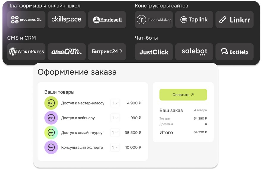 Сервис приема платежей для самозанятых подключается ко многим популярным CMS и образовательным платформам.