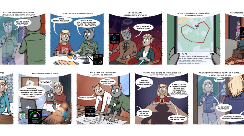 Мы привлекли популярного создателя цифровых комиксов, у которого уже была своя аудитория и полюбившиеся ей герои – человекоподобные котики, истории из жизни которых тепло откликались подписчикам. Новый комикс, сюжет которого крутился всецело вокруг Bip U Pro, сохранил авторский стиль и некий уют, что вызвало самые теплые отклики аудитории.