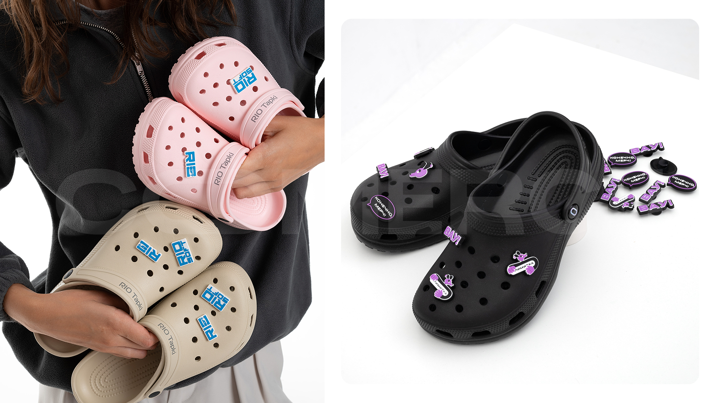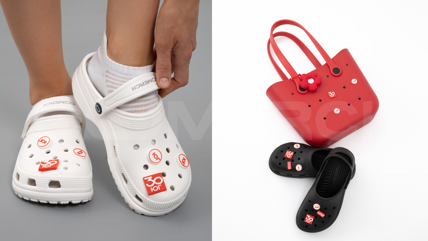 Для компаний «Девелопмент ЮГ», «Риа Софт» и даже для себя, в COMERCH мы создавали кроксы в фирменном цвете и добавляли тематические сменные джибитсы. И реакция была просто огонь! Сменные джибитсы позволяют каждому собрать свой уникальный комплект, а логотип компании при этом остается на виду. Такой мерч — это не только комфорт для ног, но и отличный способ прокачать корпоративный вайб.
