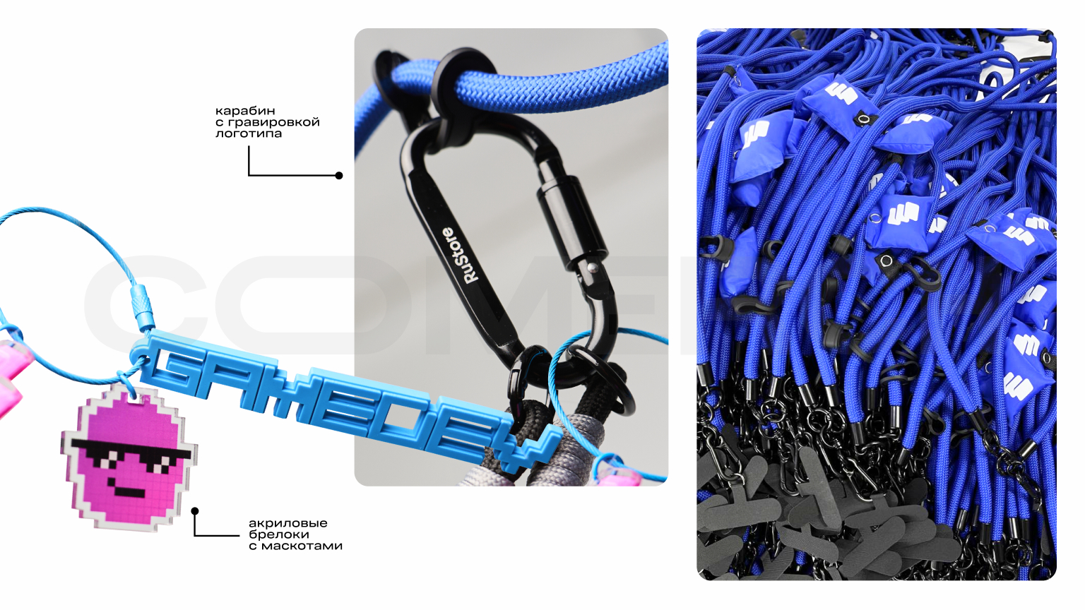 Мы отказались от привычных ланьярдов (лент для бейджей), вместо них предложили фирменные шнуры с набором продуманных подвесов. Такой формат больше подходит для геймдев среды, он визуально интересный и живой.