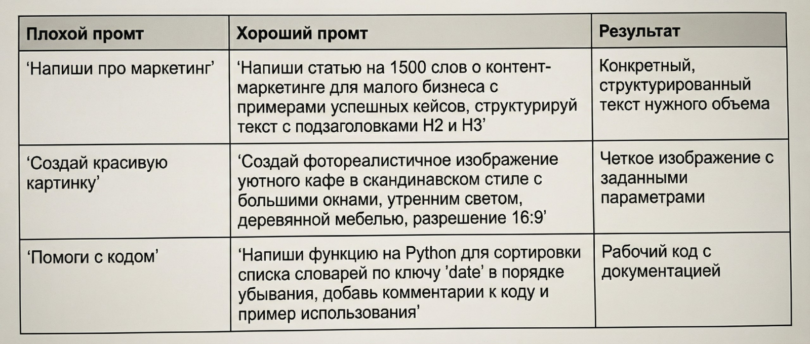 №ПравилоЧто делатьЧего избегатьПример1КонкретностьУказывайте точные числа, параметры, деталиРазмытые, абстрактные формулировки✅ "Создай таблицу с 5 колонками: Имя, Должность, Стаж, Зарплата, Департамент"❌ "Создай красивую таблицу"2Единая терминологияИспользуйте один термин для обозначения понятияСмешивание синонимов в одном промте✅ Везде "пользователь"❌ "пользователь", "юзер", "клиент" вперемешку3СтруктураРазделяйте промт на логические блоки: роль, задача, требованияСплошной текст без разделения✅ Используйте разделители, абзацы, нумерацию❌ Один длинный параграф4КонтекстПредоставьте необходимую справочную информациюПредполагать, что нейросеть "знает контекст"✅ "Целевая аудитория: B2B-клиенты, средний бизнес, IT-сектор"❌ "Напиши для наших клиентов"5Формат выводаЧетко укажите желаемый формат: список, таблица, эссе, JSONОставлять формат на усмотрение ИИ✅ "Формат: маркированный список из 10 пунктов"❌ "Дай мне информацию"6ПримерыПоказывайте 1-3 примера желаемого результатаОписывать словами без демонстрации✅ "Вот пример: [конкретный пример]. Создай 5 аналогичных"❌ "Сделай что-то похожее на то, что обычно делают"7ОграниченияЯвно указывайте, что НЕ должно быть в результатеТолько позитивные инструкции✅ "Не используй жаргон, избегай абстракций, не превышай 500 слов"❌ Только "используй простой язык"8РольОпределяйте экспертную роль для нейросетиОбщие запросы без указания роли✅ "Ты — опытный юрист, специализирующийся на трудовом праве"❌ "Помоги с юридическим вопросом"9ПроверкаПросите ИИ проверить свой результат на соответствие критериямПринимать первый ответ без валидации✅ "После создания проверь: объем, структура, тон. Если что-то не так — исправь"❌ Не добавлять шаг проверки10ИтеративностьУлучшайте промт на основе результатовОжидать идеального результата с первой попытки✅ Тестируйте → анализируйте → уточняйте → тестируйте снова❌ Разочаровываться после первой неудачи