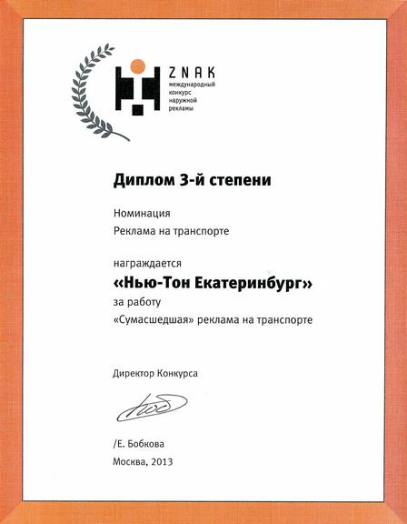 Целью конкурса «Знак» является демонстрация лучших работ в области наружной рекламы, выявление наиболее креативных и эффективных компаний, готовых предоставить свои услуги заказчикам. «Нью-Тон» стал призером в номинации «Реклама на транспорте» и занял почетное третье место с «Сумасшедшей» рекламой на транспорте» для городского портала Екатеринбурга «66.ru».