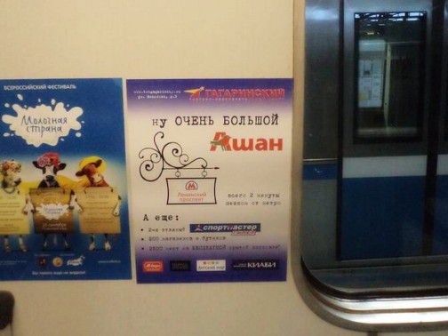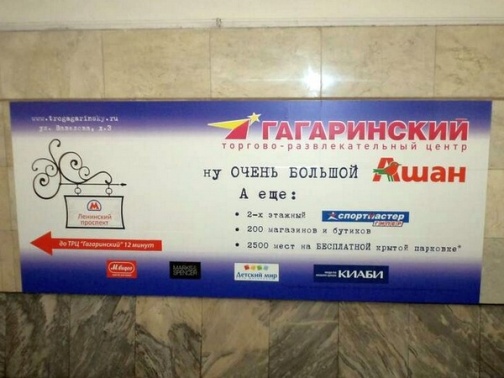 Среди торговых центров, чью рекламу можно было увидеть этой осенью в московской подземке, были такие комплексы как «Азовский», «Гагаринский» и т.д. Так, ТЦ «Азовский» запустил в октябре звуковую рекламу о бесплатном выступлении группы «Корни», нацеленном на привлечение покупателей. Рекламные ролики звучали на всех станциях Московского метрополитена, оборудованных звуковой рекламой. ТЦ «Гагаринский» с 1 сентября разместил на 4 месяца рекламу на эскалаторных щитах, путевых щитах, стикерах в вагонах метро и звуковую рекламу. В адресной программе были задействованы все основные станции с большим пассажиропотоком.