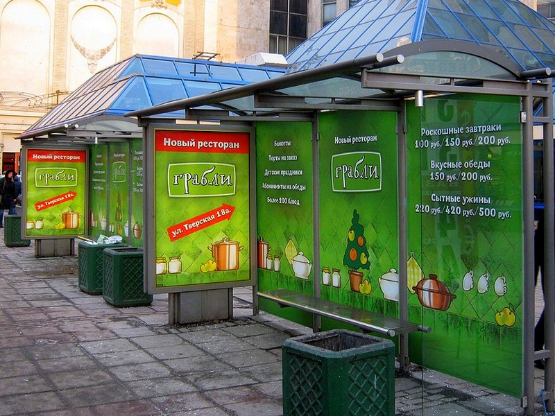 Сеть ресторанов «Грабли» проводит рекламную кампанию на остановочных павильонах для продвижения нового ресторана сети на Тверской улице. Размещение наружной рекламы реализовало рекламное агентство «Нью-Тон».