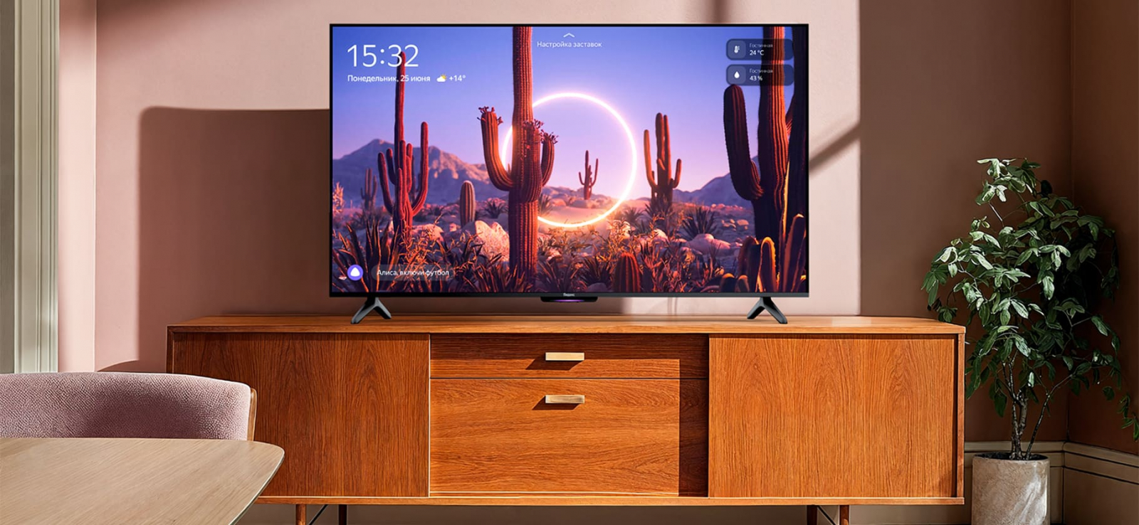 Модель для тех, кто ценит внешний вид техники. Безрамочный дизайн Frameless делает телевизор визуально дороже своей цены. IPS-матрица гарантирует, что цвета не будут искажаться при взгляде сбоку — актуально, если экран стоит не строго напротив дивана. Внутри — удобная оболочка Яндекса с Алисой.