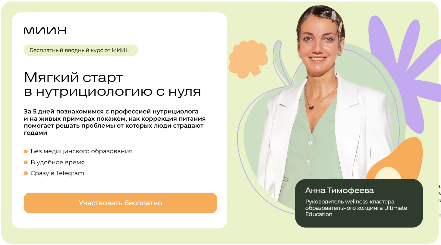 Для тех, кто хочет познакомиться с профессией перед принятием решения об обучении, МИИН предлагает бесплатный 5-дневный вводный курс «Мягкий старт в нутрициологию». За 5 дней — по одному видео и практическому заданию ежедневно — можно понять суть профессии, узнать, как коррекция питания реально влияет на здоровье, и оценить, подходит ли это направление лично вам. Обучение проходит в Telegram-боте, доступ открывается сразу после регистрации.