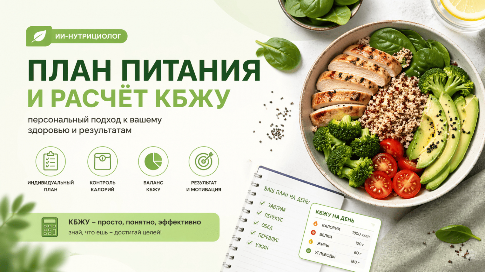 Кому подходит: всем, кто хочет персональный план питания с детальным расчётом КБЖУ, рецептами и возможностью вести диалог о рационе.