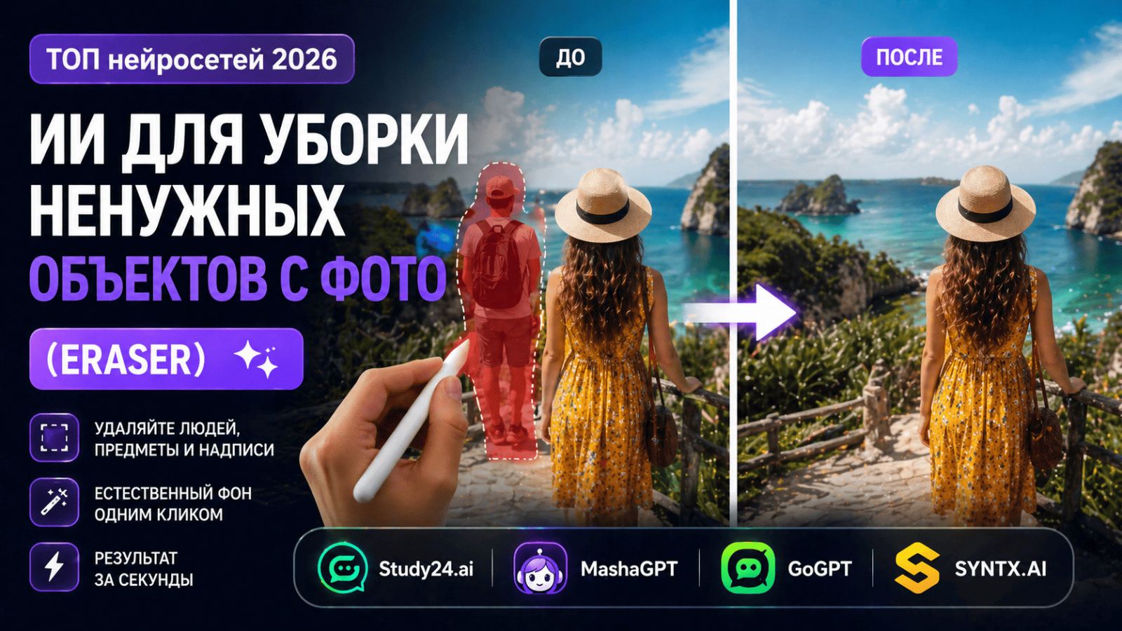 Удалить объект с фото, убрать лишнее или стереть человека теперь можно за секунды. Нейросети автоматически удаляют нежелательные объекты с изображений, восстанавливают фон и сохраняют качество без фотошопа. В этом обзоре — лучшие AI eraser инструменты 2026 года и как ими пользоваться.