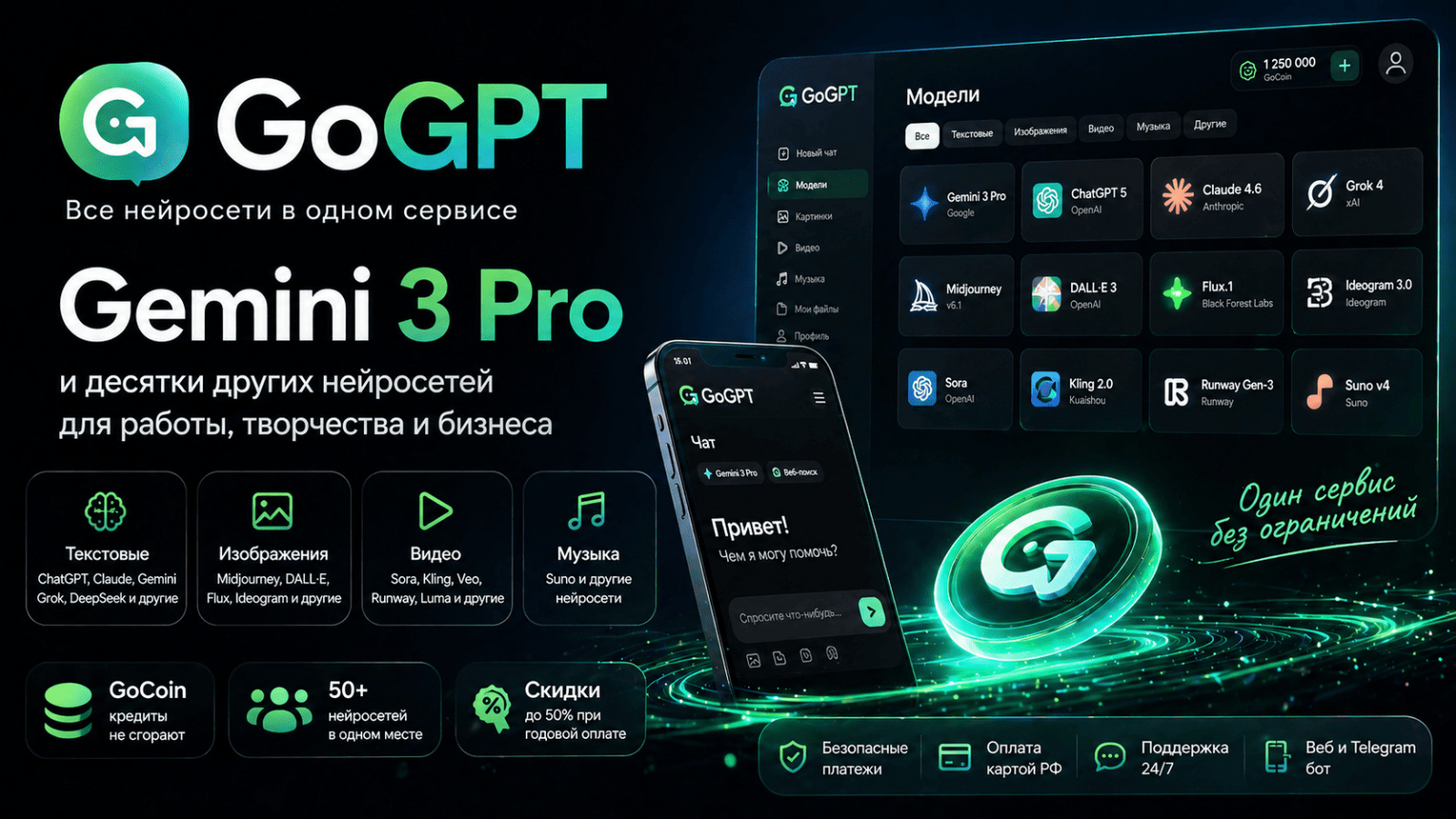 - GoGPT — для продвинутых задач и выбора моделей
