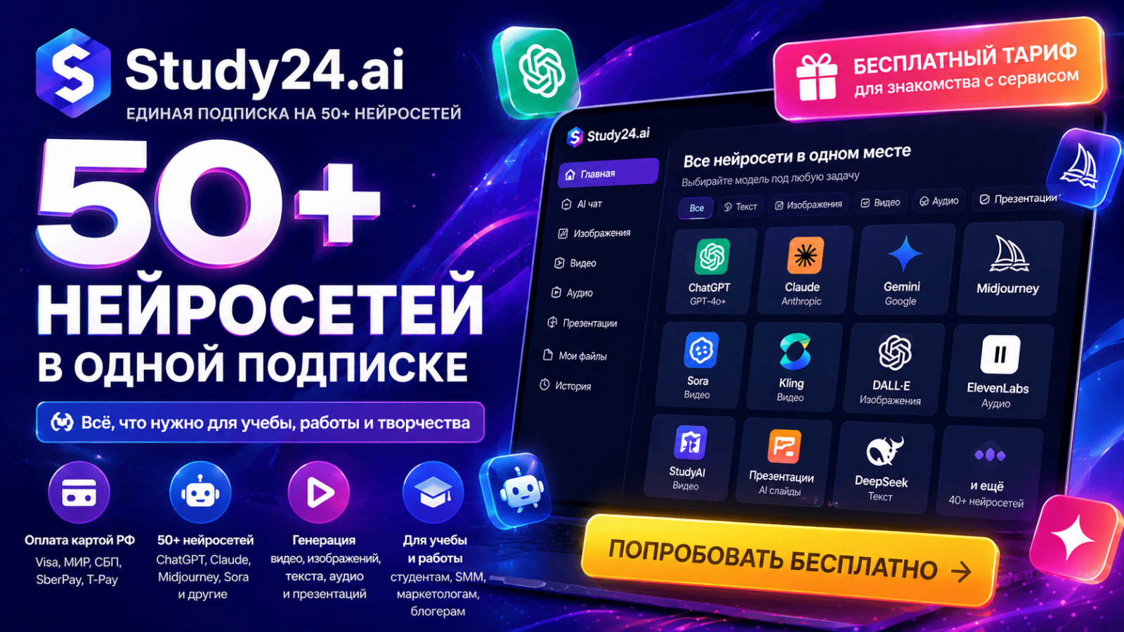 Study24.ai — платформа с доступом к десяткам нейросетей в одном интерфейсе.