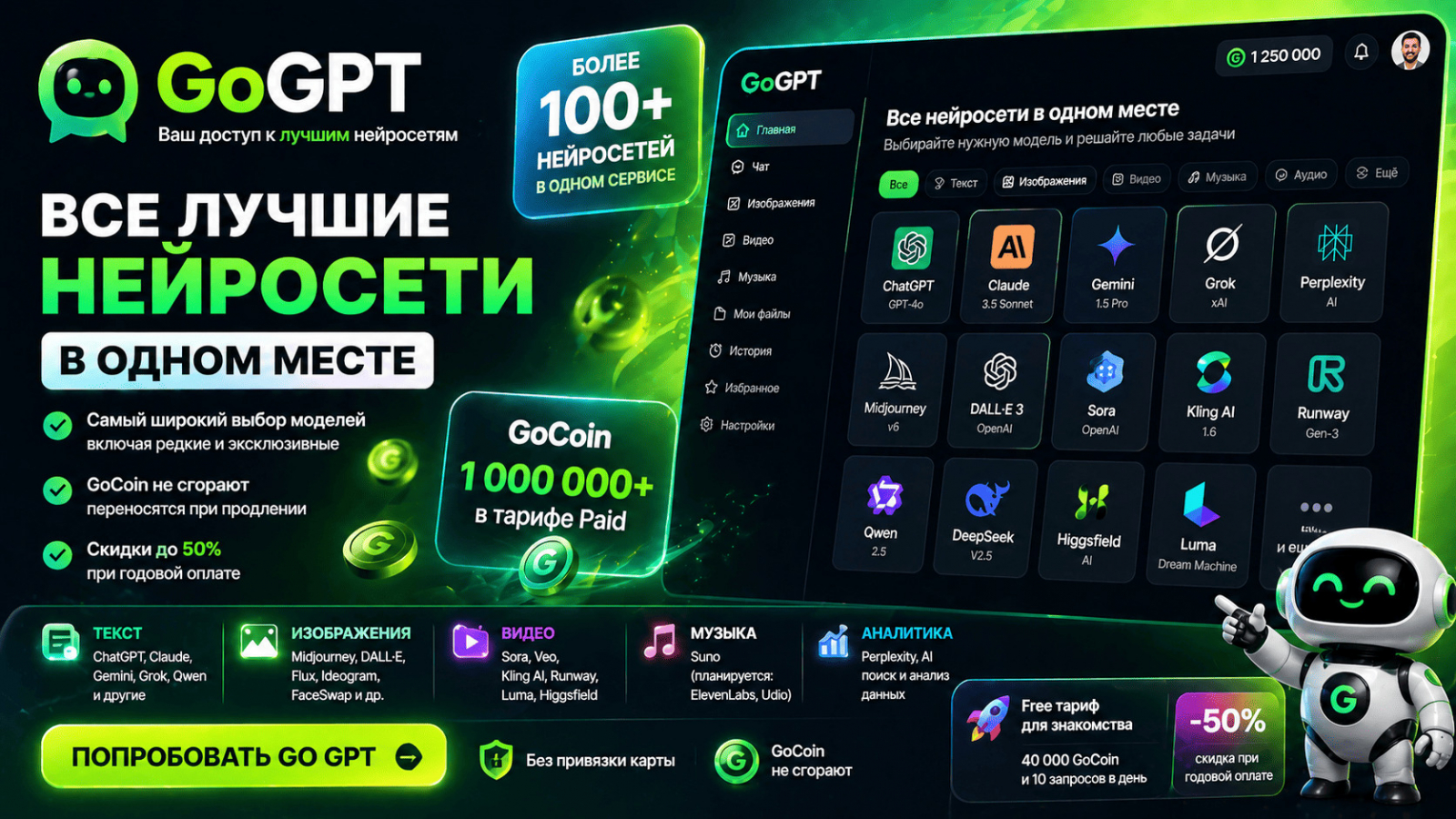 GoGPT — сервис с большим выбором моделей и гибкой системой использования.